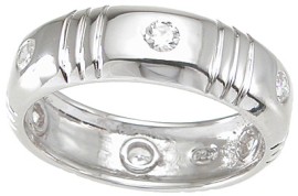 This is a one of a kind cubic zirconium silver ring. The high polish rhodium finish gives this sterling silver ring the platinum look. It is almost impossible for an untrained eye to distinguish the difference between real platinum and rhodium finish silver jewelry. The cutting edge finish makes this silver jewelry stand out above and beyond normal silver ring. The stones are firry and filled with sparkle. This silver ring is of the finest quality, and the workmanship is flawless. The difference is truly remarkable. This is the same finish applied to fine platinum and white gold jewelry. This revolutionary finish gives the silver jewelry longer durability against tarnish. Silver is the newly weds choice of ring. The advantages of rhodium finish silver jewelry is far too many to list in full, but here are few. Silver also has similar hypoallergenic properties as gold. Therefore, most people will not have allergic reactions. They are great for honeymooning, vacationing or while traveling. The replacement cost offers piece of mind and versatility in personal selection to the individual. |